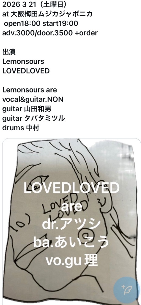 2026.3.21 (土) 梅田 ムジカジャポニカ『lemonsours 1st アルバム “mo”発売記念ツアーin大阪』lemonsours(NON : vo,g 山田和男 : g,cho タバタミツル : g,cho 中村清 ds)LOVEDLOVED(Osamu : vo,g AIKOH b Atsushi ds)